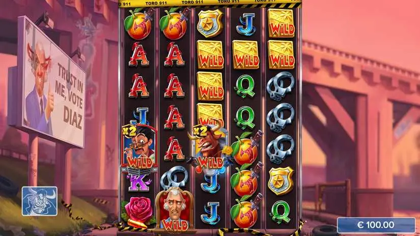 The Wild symbol substitutes for all symbols except Toro, Diaz, and Matador. A payline of Wild symbols pays out on the highest-value symbols.