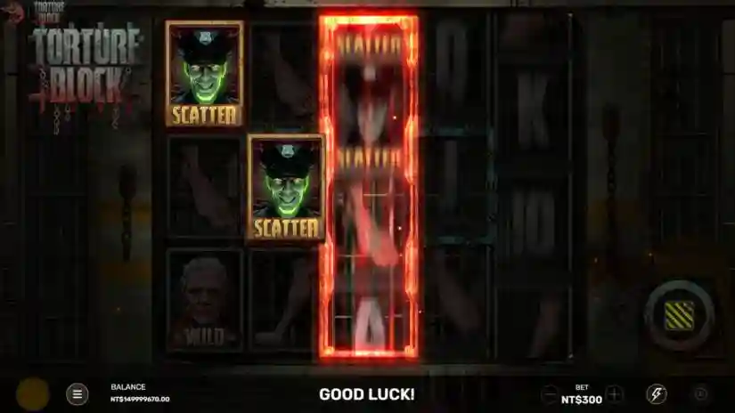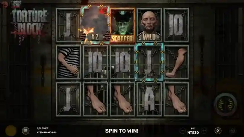 The maximum win in Torture Block is capped at 15,000 times the bet. When the total win for a round reaches this limit, the round ends immediately, awarding wins up to the maximum amount, and all remaining features are voided.