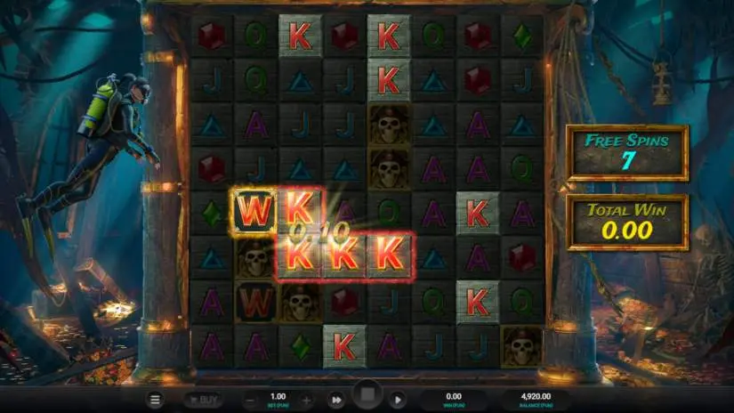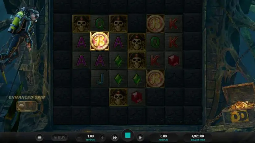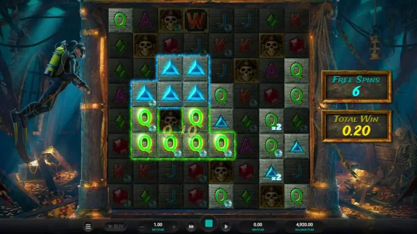 The Galleon Bonus awards 8 free spins. There are no blockers during the Galleon Bonus. When a cluster is formed, winning symbols are evaluated and removed from the reels. Current symbols fall into the resulting void, and new symbols are added from above the reels.