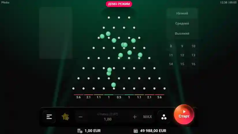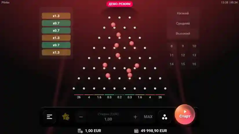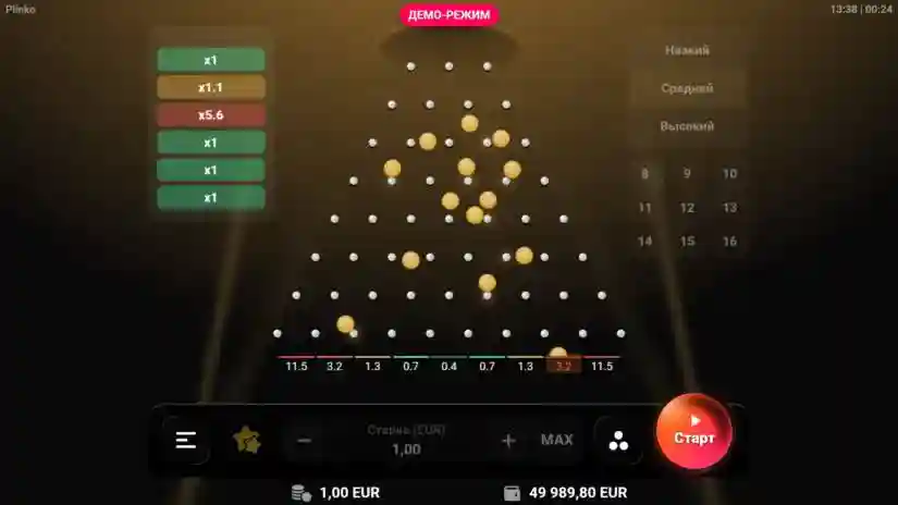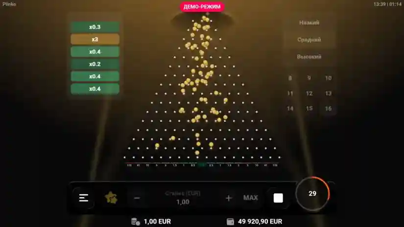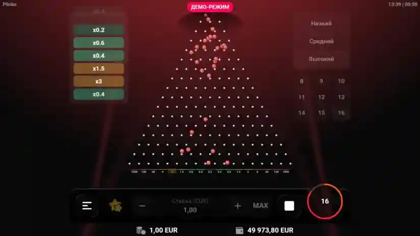 The player can control the game’s volatility by setting the risk level and the number of paylines. Selecting the number of paylines from 8 to 16 affects the size of the game board and the number of slots with multipliers at the bottom. The risk level affects the range of multipliers for the slots at the bottom of the board and the frequency of wins:
