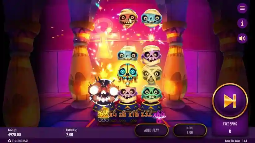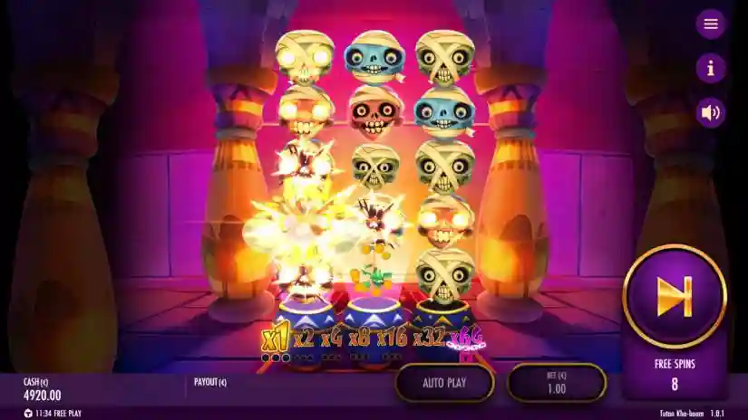 Tutan Kha-boom is a 3-reel, 5-row video slot from Thunderkick with 99 payline combinations. The game features Avalanche, Exploding Wilds, multipliers, and a bonus game with free spins, re-triggers, and wild collection. The theoretical return to player (RTP) is 94.17%. A game round is triggered by pressing the action button and plays at the selected bet level. Autoplay automatically starts the game for the selected number of game rounds on the Autoplay page. This feature may be unavailable. All payouts and winning combinations are paid out according to the paytable. All wins are displayed and paid out in the selected currency.
