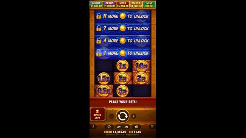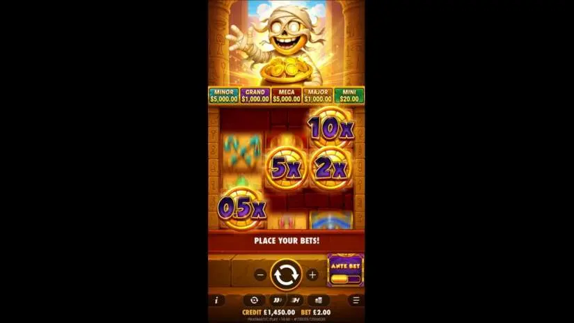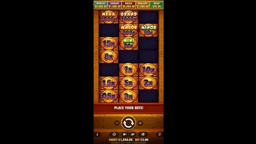 Each time it lands, it receives a value from a predetermined set. Possible values: 0.5x, 1x, 1.5x, 2x, 3x, 5x, 8x, 10x, 15x, 20x (MINI), 50x (MINOR), 100x, 150x, 200x (MAJOR), 1000x (MEGA), or 5000x (GRAIN) of the total bet.