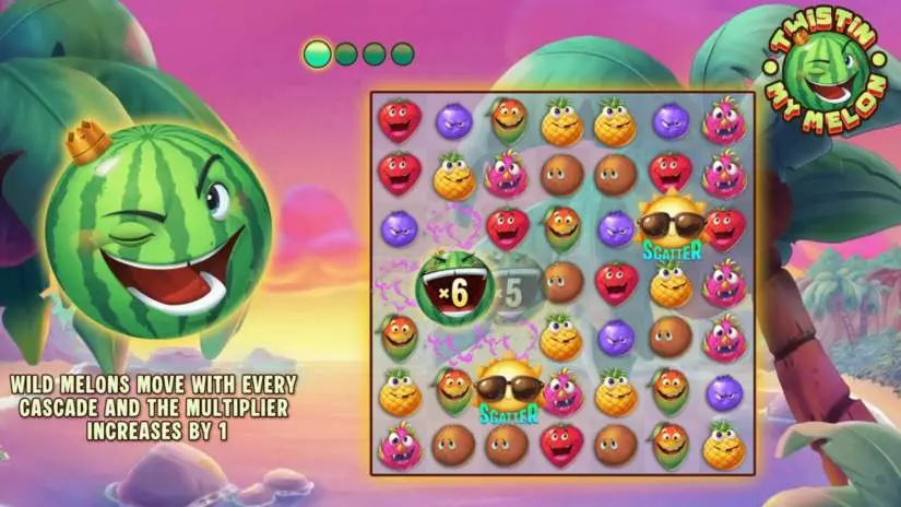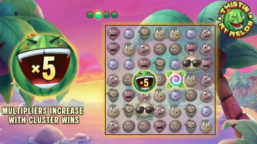 Any Melon symbol is a wild symbol and can affect one or more adjacent clusters. If a Melon symbol is involved in a cluster win, it moves to an adjacent unused reel, and the multiplier is increased by 1. If two or more Melon symbols are involved in a cluster win, the multipliers are summed and applied to the cluster win.