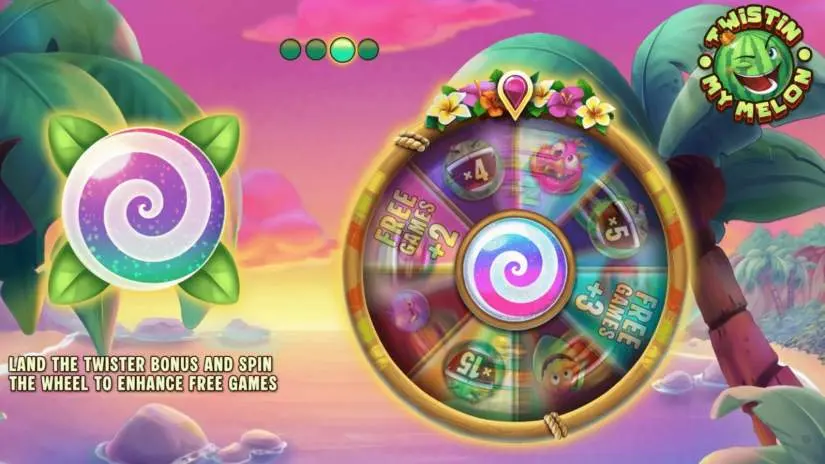 Any Twist symbol appearing in view activates the bonus wheel. The player is given one spin of the wheel to guarantee a win. The bonus wheel can award: