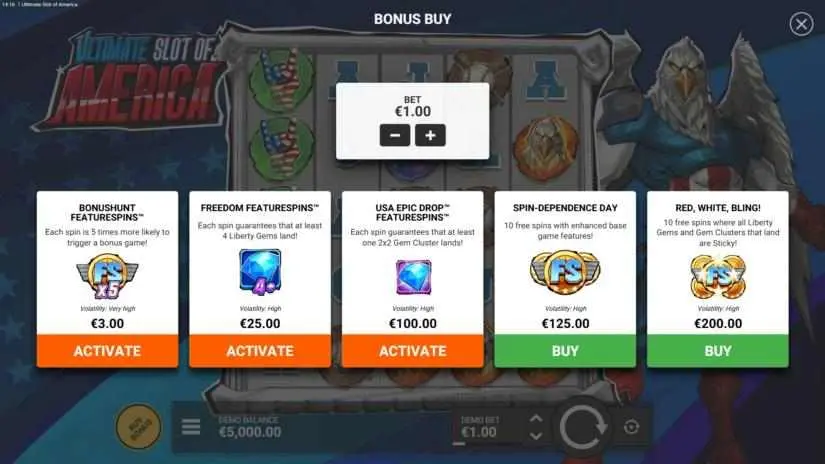 This Hidden Epic Bonus retains the mechanics of SPIN-DEPENDENCE DAY. In addition, a minimum of 5 Freedom Symbols are rolled on each spin, not counting the Freedom Respins! If several additional FS symbols are rolled at the same time during the bonus, you will get more free spins: