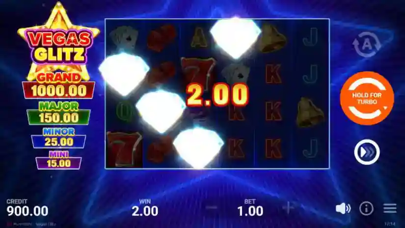 A winning line in Vegas Glitz occurs when symbols form a combination from the leftmost reel to the rightmost reel. Only the best combination on a line is paid. The number of active lines is fixed at 30.