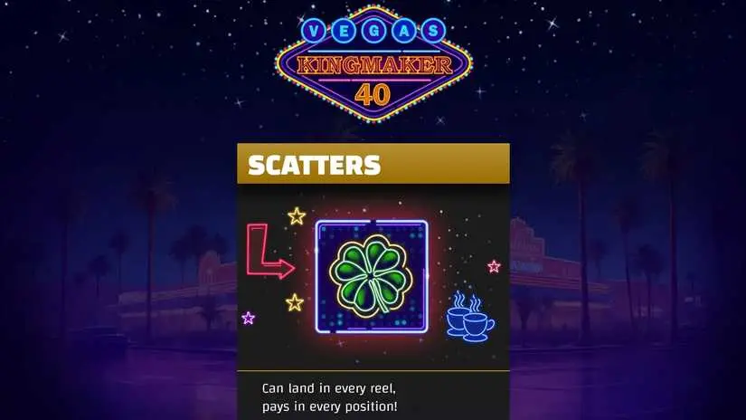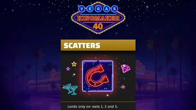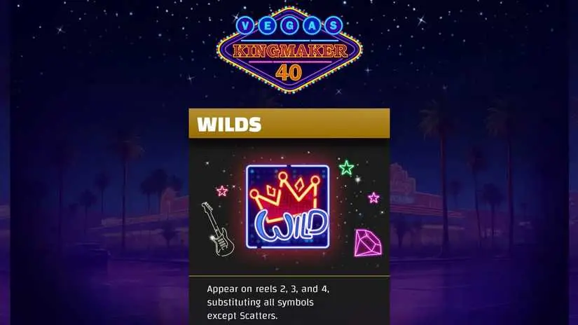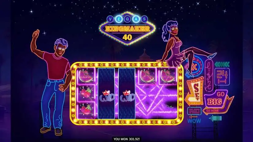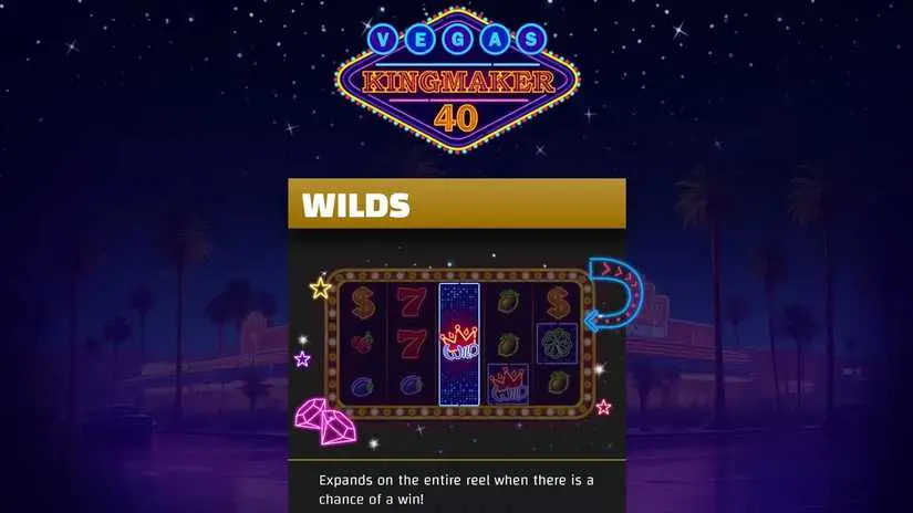 Vegas Kingmaker 40 by GameArt is a 5-reel, 3 by 40 payline slot. Features include expanding wilds and scatter payouts. The theoretical return to player is 96.43%.