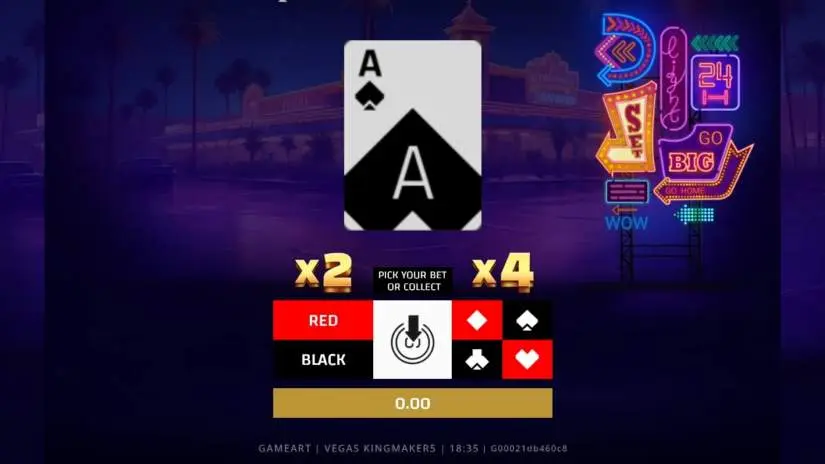 To gamble any win in Vegas Kingmaker 5, press the Gamble button. Choose a red or black card to double your winnings. Choose a suit to quadruple your winnings. Wins are multiplied if chosen correctly. Wins can be gambled up to 5 times. Losing the gamble will result in the loss of all winnings. The Gamble feature can be enabled/disabled in the settings menu. If the game is enabled, press the COLLECT button to collect your winnings and spin the reels again.