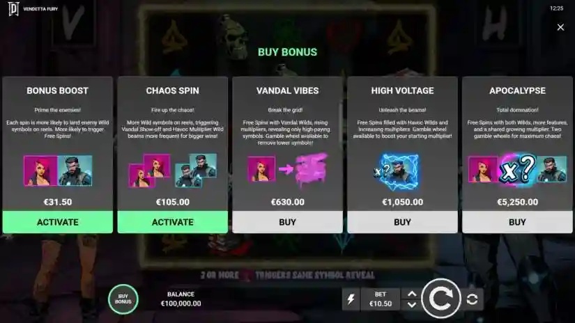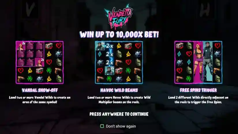 Welcome to Vendetta Fury from Degen Studios! In this chaotic city, precision and brute force collide in heated battles. Vendetta Fury is a 5-reel, 5-row video slot with payouts on 15 fixed paylines for 3 or more matching symbols, starting from the leftmost reel and moving left to right. The game features low-paying symbols, high-paying symbols, and two types of Wild symbols: Vandal Wild and Havoc Wild. Win up to 10,000x your bet!
