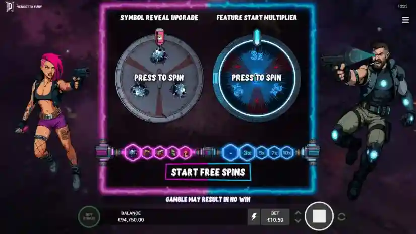 Vandal Vibes Bonus – 60x the bet. Destroy the playing field! Free Spins with Vandal Wilds, increasing multipliers, and only high-paying symbols are revealed. A gamble wheel is available, allowing you to remove low-paying symbols!