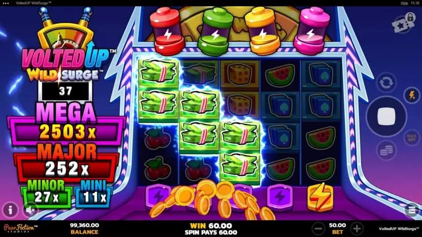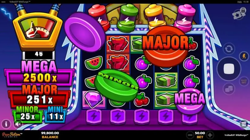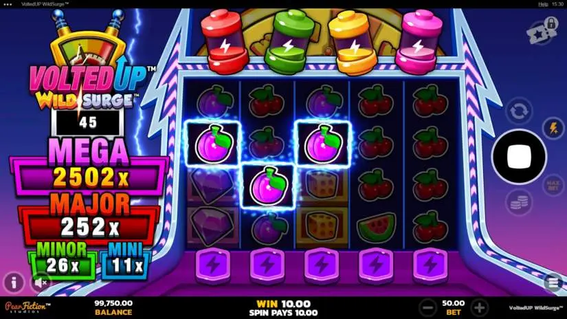 VoltedUP WildSurge is a 5-reel, 4-row slot machine from Pear Fiction Studios. The goal is to spin the reels until a winning combination appears. Winning combinations are highlighted on the reels and pay out.