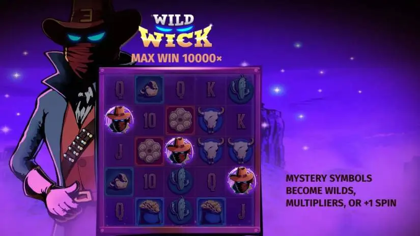 The Wild Wick slot from BGaming transports you to a godforsaken town somewhere on the plains of the Wild West. It’s a harsh and dangerous place, but here you can find riches beyond your wildest dreams. Spin the reels if you dare, but beware: Wild Wick, a notorious outlaw with a temper as fiery as his trigger, watches over this town. Cross him, and you could walk away with a fortune—or escape unscathed. The game reflects Wild Wick’s unpredictable nature: if a spin doesn’t result in a winning combination, it could simply mean you won’t win anything, or it could trigger a random wild symbol, giving you a second chance. There are also two types of free spins, each with its own special multiplier. And keep an eye out for Mystery symbols—they can significantly increase your winning potential.