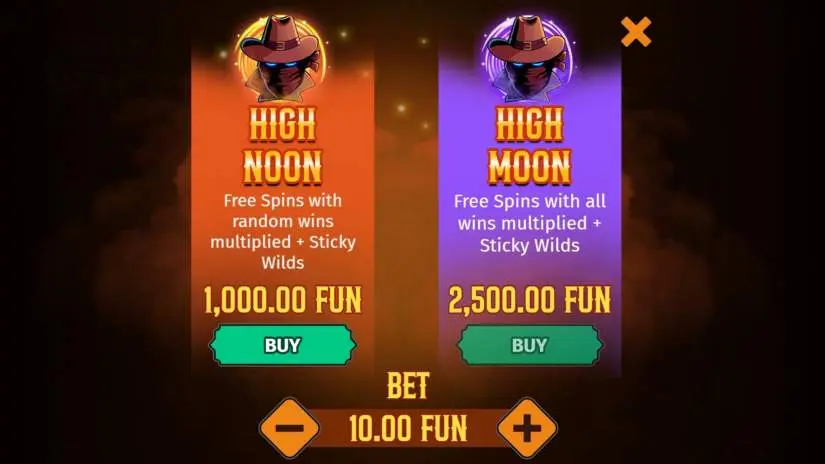 Both Free Spins (High Noon) and Super Free Spins (High Moon) have a progressive multiplier. The multiplier starts at x1. When you win, the number of symbols in the winning combination is added to the multiplier. For example, 3 symbols gives x3. The increased multiplier is applied from the next spin. In free spins, it applies to random wins, and in super free spins, it applies to every win.