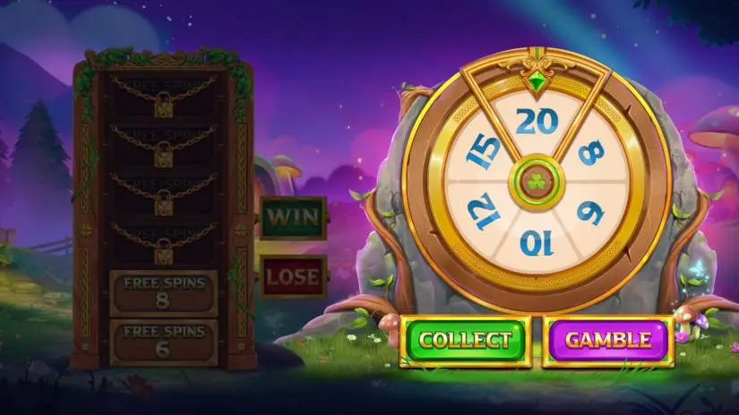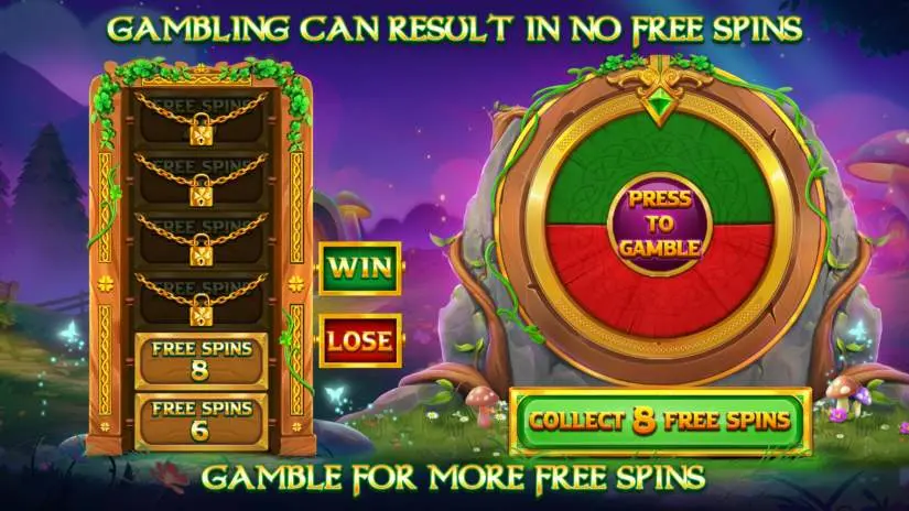 Before the round begins, an initial number of free spins is randomly awarded. Possible values are: 6, 8, 10, 12, 15, or 20 free spins. The player has the option to gamble to increase the number of free spins or to withdraw the current number at any time. The gamble feature begins with the allocated number of spins and can be used to advance to the next, higher number. If the player chooses to gamble, the wheel spins and can land on a win or loss. If the outcome is a win, the next higher number of free spins becomes the current win, and the player can gamble again for an even higher number. If the outcome is a loss, the round ends immediately, and all previous wins are forfeited.