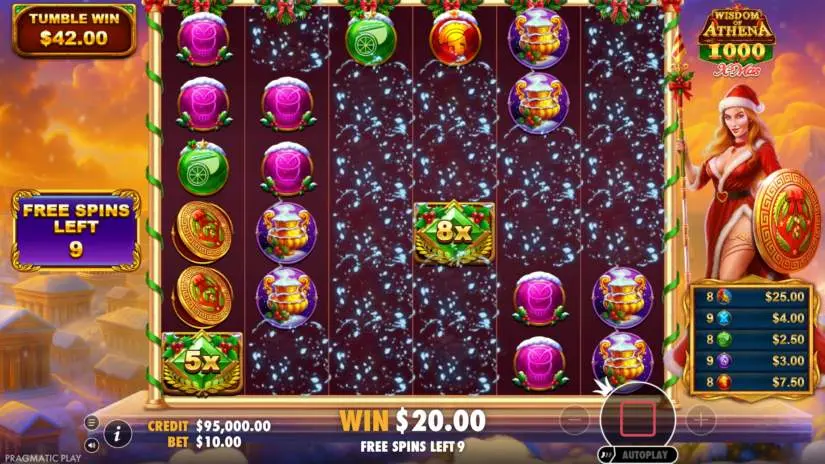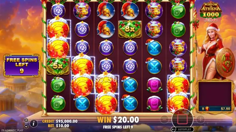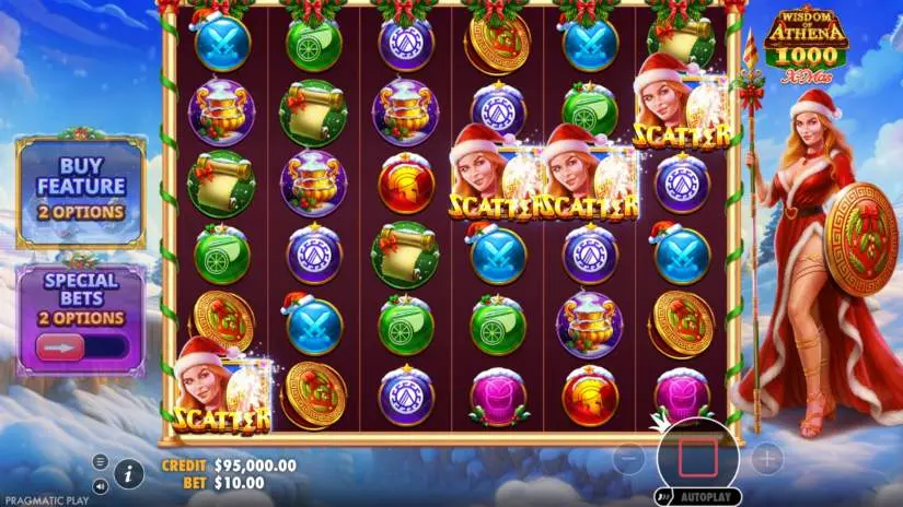 Symbols in Pragmatic Play’s Wisdom of Athena 1000 Xmas pay out anywhere on the screen. The total number of matching symbols on the screen at the end of the spin determines the winning amount. Athena returns with a snow-covered special edition of her iconic slot, where consecutive wins unlock additional grid cells in the top row.