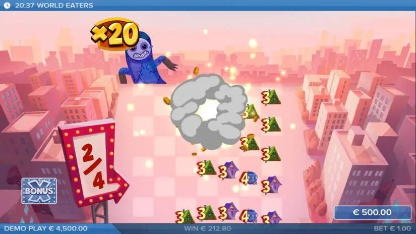 The maximum total win per game round in World Eaters is 10,000x the bet. The game round ends immediately after reaching the limit, and all winnings are paid out. Bets cannot be changed during a game round. The theoretical payout (RTP) is 94.0%.