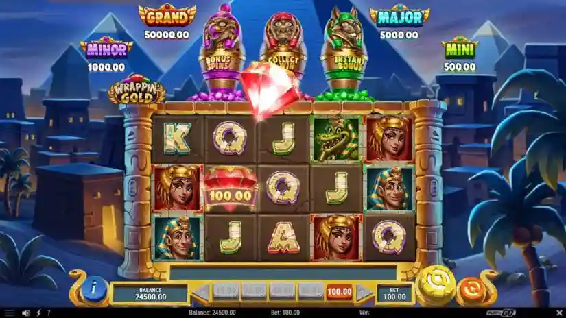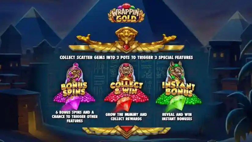 Wilds can appear on all reels and substitute for all symbols except Scatter Gems and Mummy Symbols. When they land, they can randomly trigger the Instant Bonus feature.