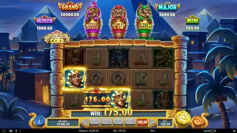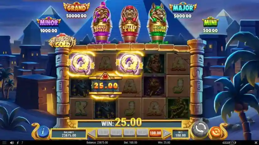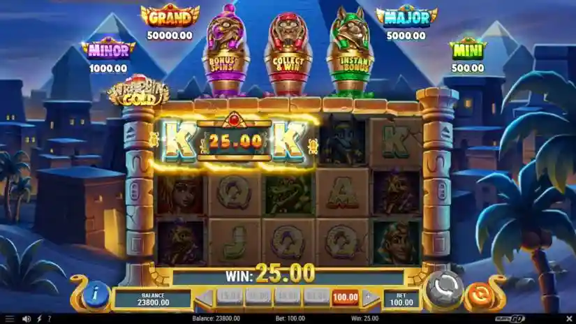 Once the Mummy Symbol reaches 5×5, no additional spins are added. All Coins and Collect & Win Scatter Gems earned during the Collect & Win feature are awarded when the feature ends.