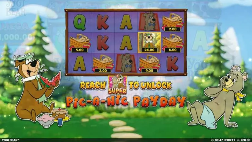 Collect 14 Collect symbols to activate the Super Bonus Scatter symbol. The Super Bonus Scatter symbol can only appear on reel 4. To activate the Super Bonus, land the standard Bonus Scatter symbol on reels 2 and 3, and the Super Bonus Scatter symbol on reel 4. The Super Bonus is split into two parts. First, 10 bonus spins are played. Then, the Picnic & Payday bonus is played.